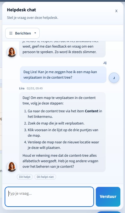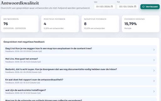 Lira is niet zo maar een chatbot. Ze traint zichzelf op jouw artikels en snippets en wordt continu bijgestuurd zodat haar antwoorden betrouwbaar blijven.