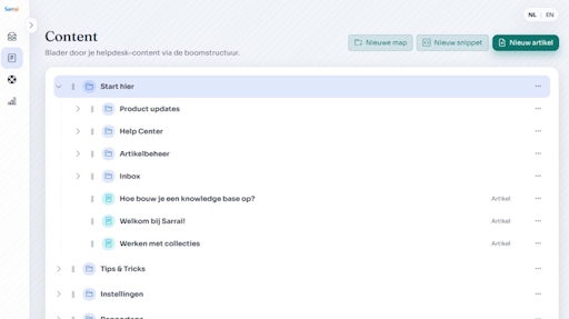 Sarrai dwingt een heldere kennisarchitectuur af per domein, doelgroep en type vraag. Daardoor wordt informatie sneller vindbaar en beter onderhoudbaar.