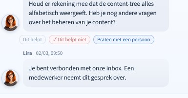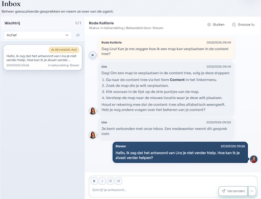 Als de klant zich niet verder geholpen voelt door Lira, dan kan die vragen om een persoon te spreken. Via de inbox volgt jouw team het gesprek daarna naadloos op.